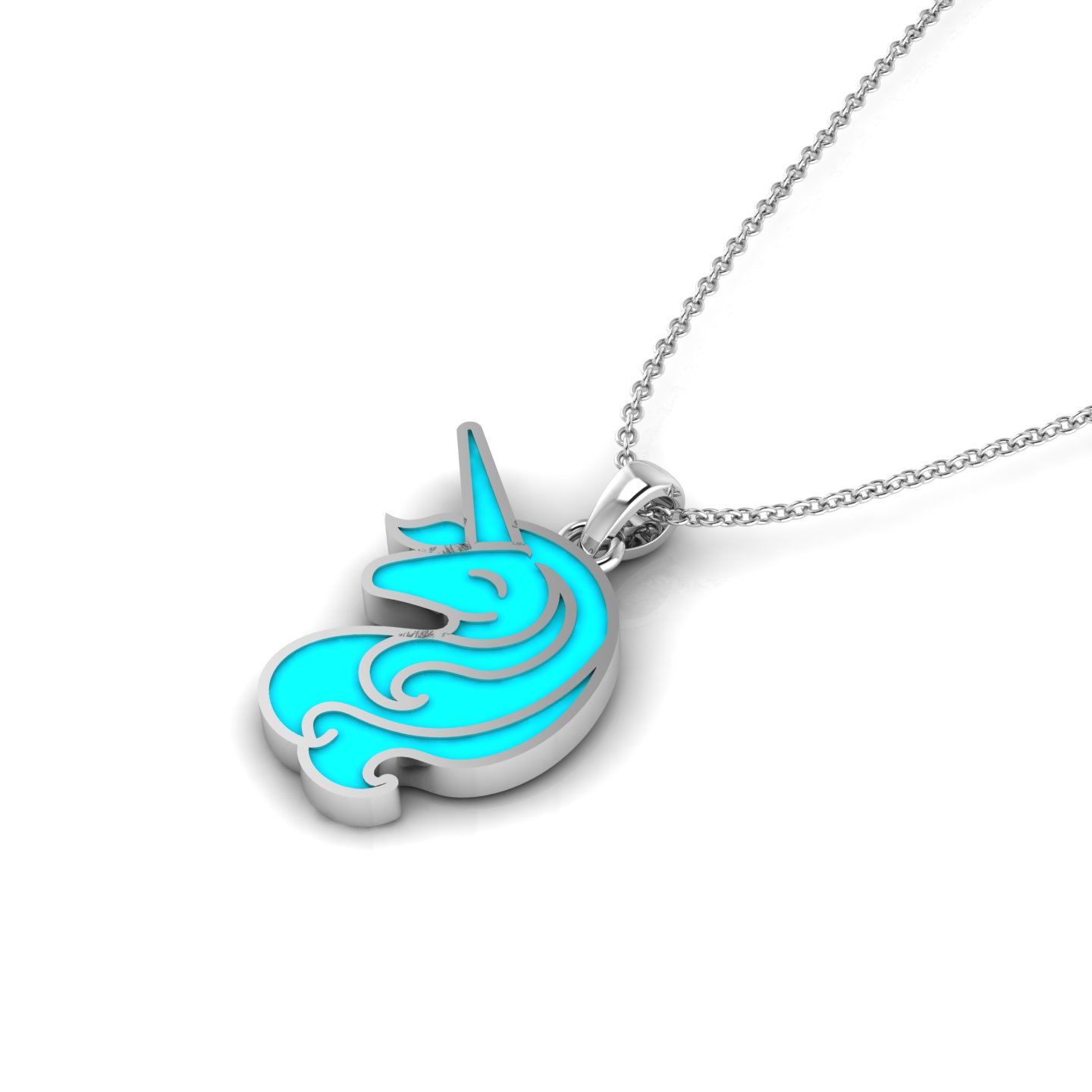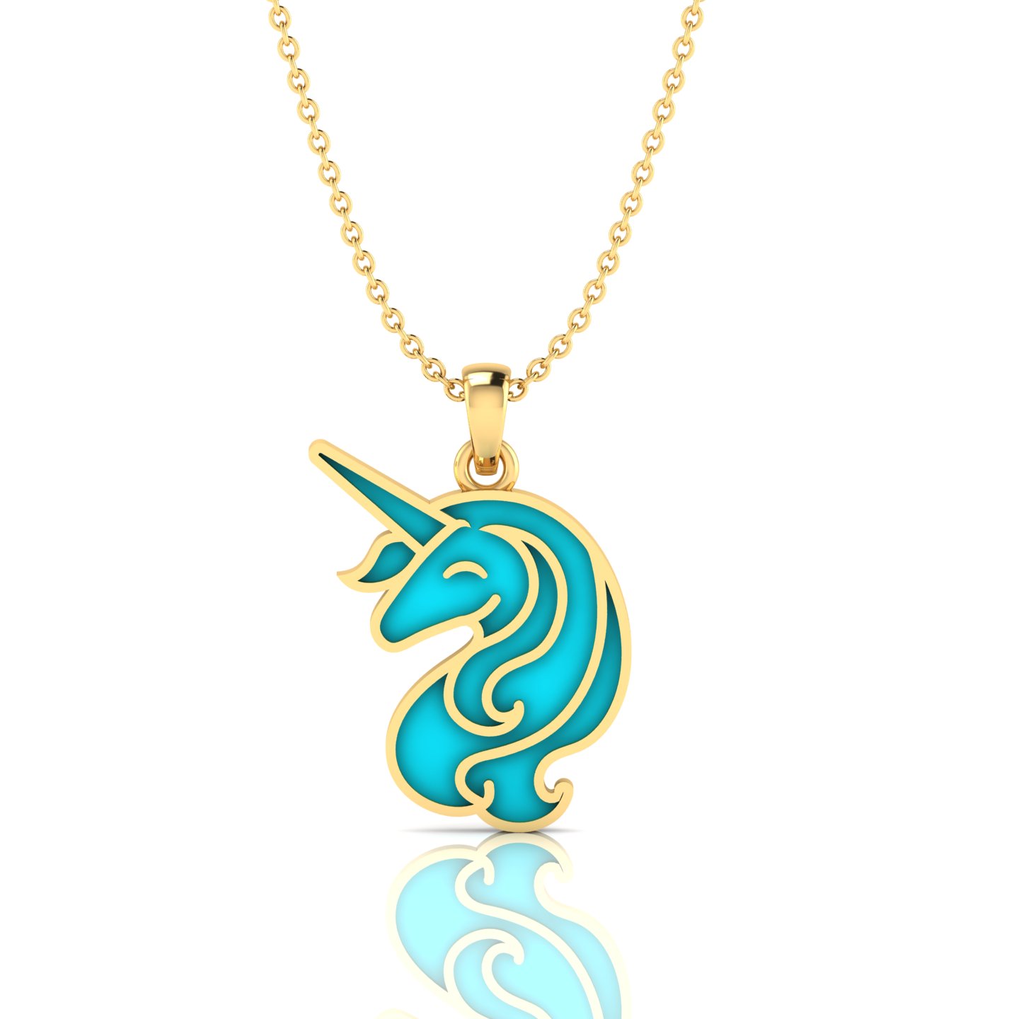 Bring a little magic to her jewelry box with this aqua blue enamel rose-gold-plated unicorn charm pendant. This pendant is shaped like a unicorn head in side profile, with a long, pointed horn and a smooth, curved face featuring a closed eye. Its flowing mane has soft, curved swirls with small decorative curls at the bottom. As you look for a unicorn pendant, the entire pendant is rose-gold-plated, with the outline defining the unicorn’s shape and separating sections of the mane for a neat, clear look. To provide a new year gift for sister that she will cherish daily, the inner surface is filled with aqua blue enamel, which contrasts nicely with the rose-gold-plated details. At the top, a rose-gold-plated bail and small round ring connect the pendant to a fine rose-gold-plated cable chain. This enamel pendant and the combination of aqua blue enamel and rose-gold-plated design creates a stylish and charming unicorn pendant.