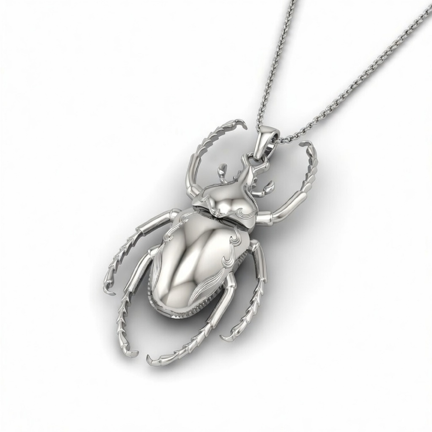 Designed specifically for her, this beetle rose-gold-plated pendant is shaped like a beetle insect with clear body details, perfect for marking a special anniversary or a promise of love. It is made from polished rose-gold-plated metal and has a shiny finish that reflects light with every movement. The entire necklace, including the pendant and the chain, is rose-gold plated, creating a look that is both modern and nostalgic. The beetle’s body has three parts: the head, thorax, and abdomen, representing the strength and beauty of nature. The head has two curved, raised horn-like shapes at the top, and the thorax is slightly rounded and joins smoothly with the rest of the body. To catch the eye, the abdomen is long and oval-shaped, with light engraved lines along the sides. The beetle has six legs, and each leg has small sections and slightly curved tips. The legs bend outward a little, which gives the pendant some shape and depth, allowing it to rest perfectly on the neckline. At the top center, there is a small rose-gold-plated bail that connects the pendant to the chain. The chain is rose-gold plated and made in a cable style with evenly spaced oval links; it matches the pendant and completes the necklace with grace.
