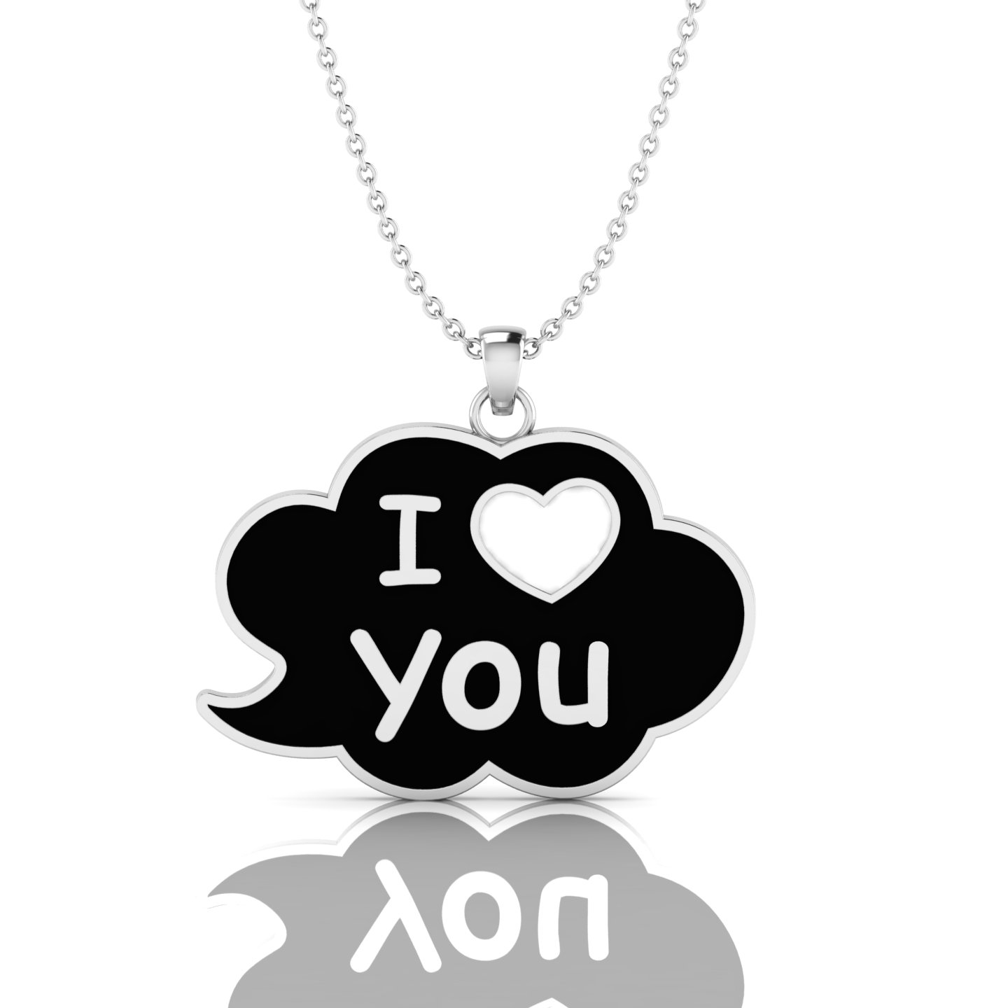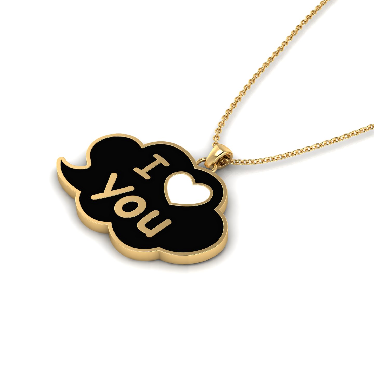 Honoring a mother or father on parents' day is easy with the black enamel rose-gold-plated I Love You cloud charm pendant, which is shaped like a soft cloud or speech bubble with smooth, rounded edges. The entire pendant is rose-gold-plated, including the border, letters, heart, and bail. The dark background of the cloud pendant is filled with black enamel, which makes the rose-gold-plated details stand out. On the top left, there is a rose-gold-plated letter “I,” and on the top right, there is a heart shape filled with white enamel. Below them, the word “You” is written in rose-gold-plated letters with a rounded font to finish the I Love You pendant design. The piece hangs from a small rose-gold-plated ring and bail, which connects it to a fine rose-gold-plated cable chain. Within this heart pendant, the black enamel and pinkish rose-gold-plated design create a cute and simple “I ♥ You” look, and the enamel pendant is perfect for everyday wear or as a gift.