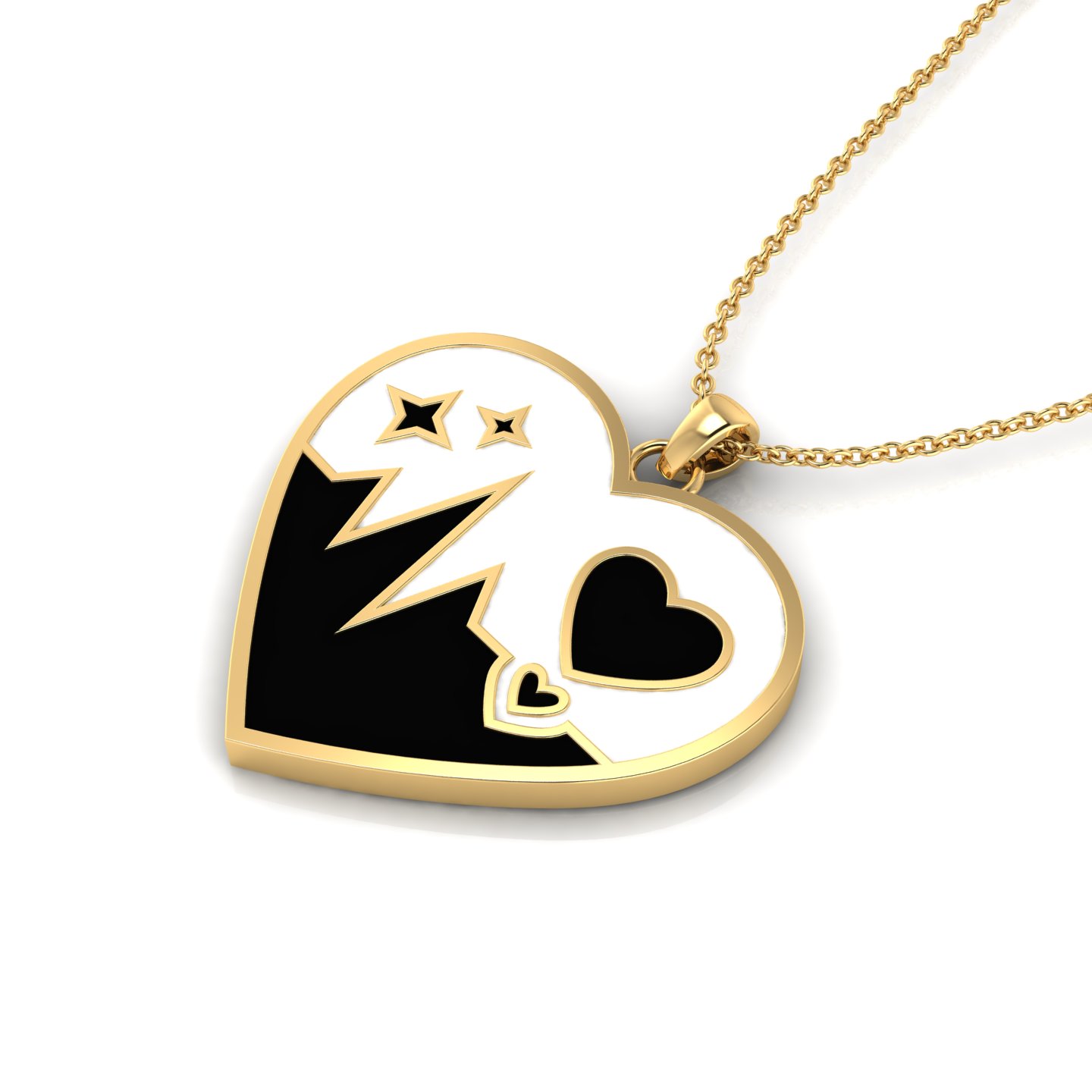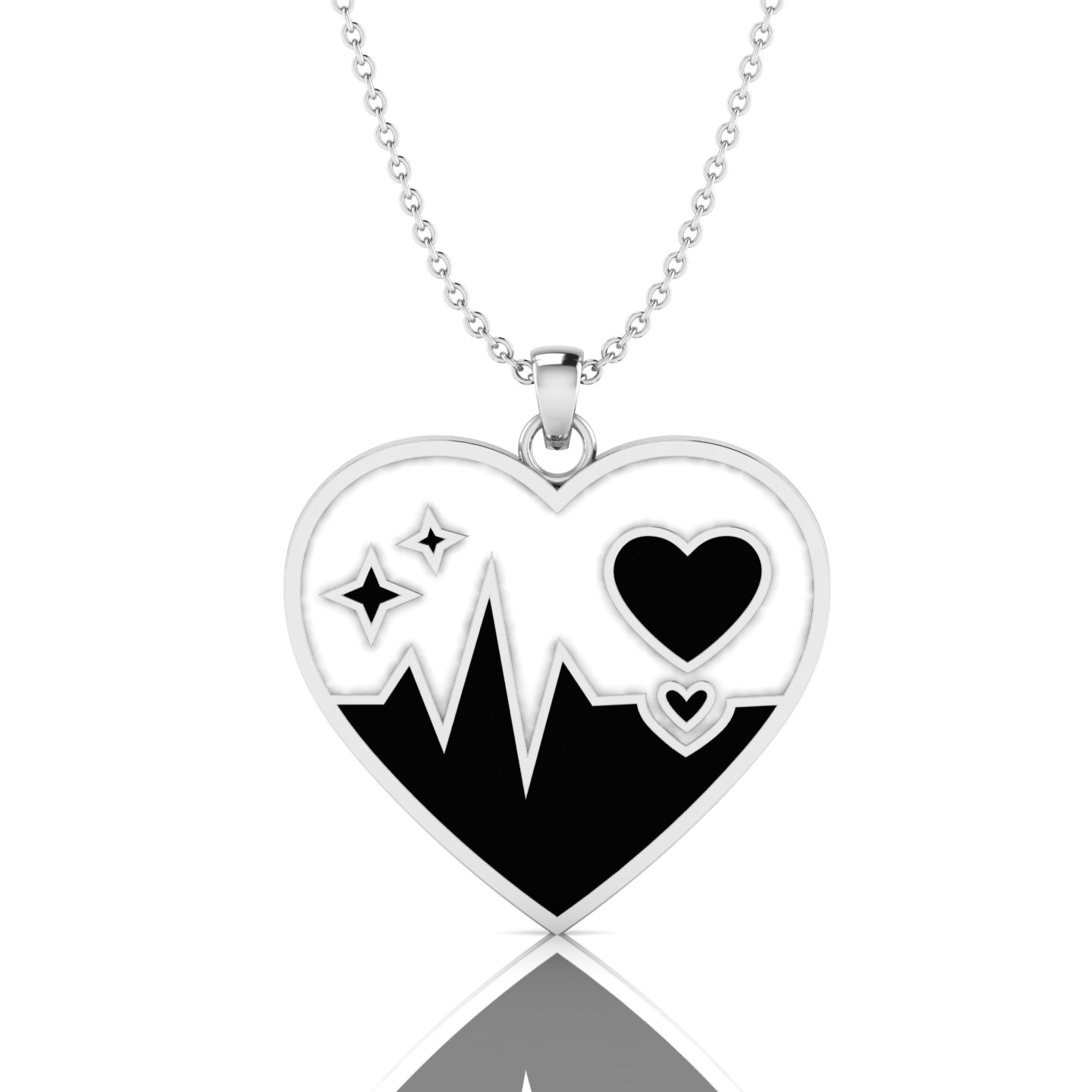 Treat yourself or a loved one to a piece that truly captures the rhythm of life. This pendant is a black and white enamel, rose-gold-plated heart-shaped heartbeat pendant. It is a wonderful choice for a self-care day treat to brighten your own mood. The heart features a smooth rose-gold-plated outline with rounded, neatly finished edges. The upper inner section is filled with white enamel, while the lower section is filled with black enamel, creating a clear contrast. This heart pendant makes a sentimental gift for a sister’s birthday or a mother during a holiday festival. At the bottom, a rose-gold-plated heartbeat line is placed over the black enamel area. On the upper right side, there is a small black enamel heart with a rose-gold-plated border. Below it sits a small double-layer heart design. On the upper left, two black enamel stars are added. Choosing this enamel pendant ensures a look that is both modern and elegant. A smooth rose-gold-plated bail connects the pendant to a delicate rose-gold-plated chain.