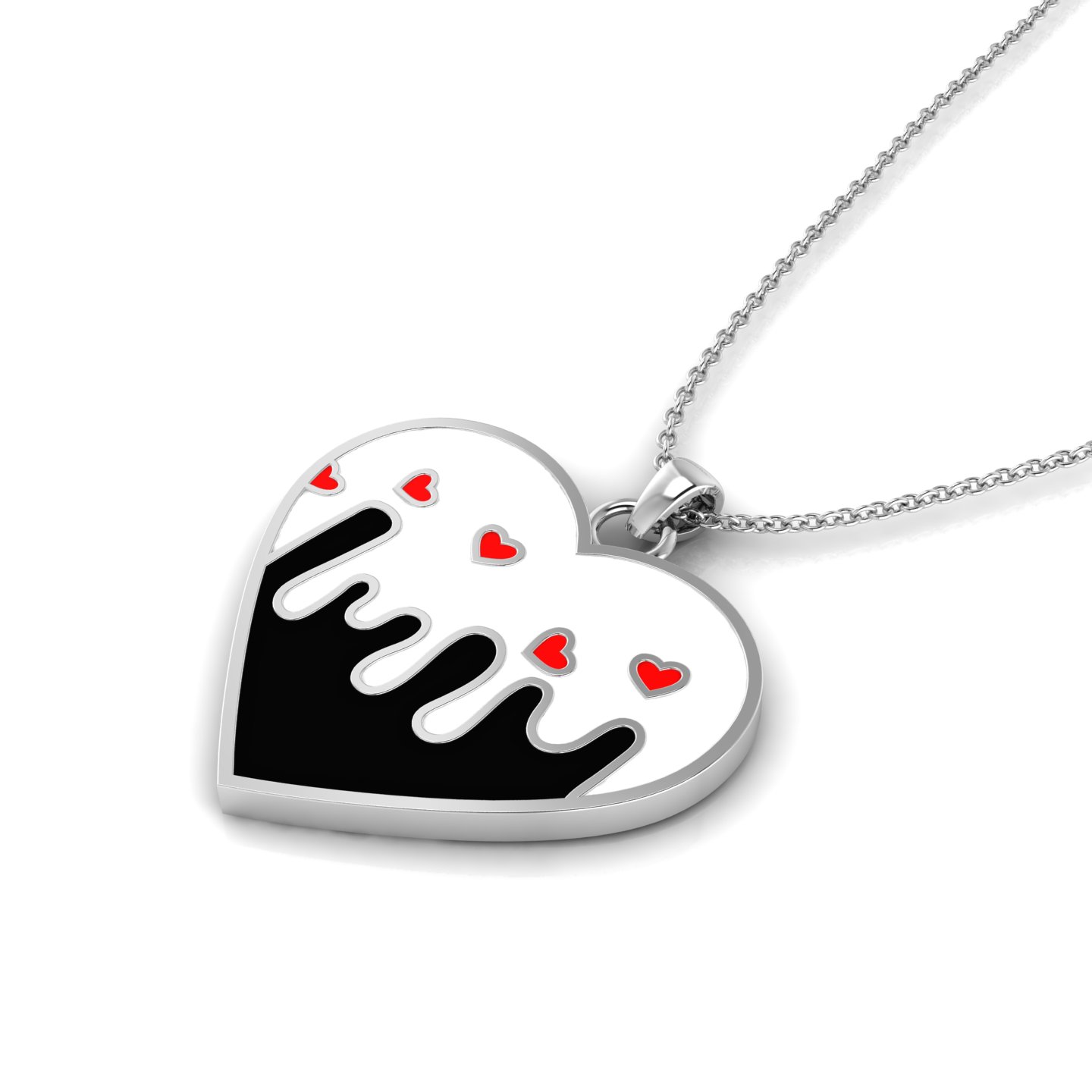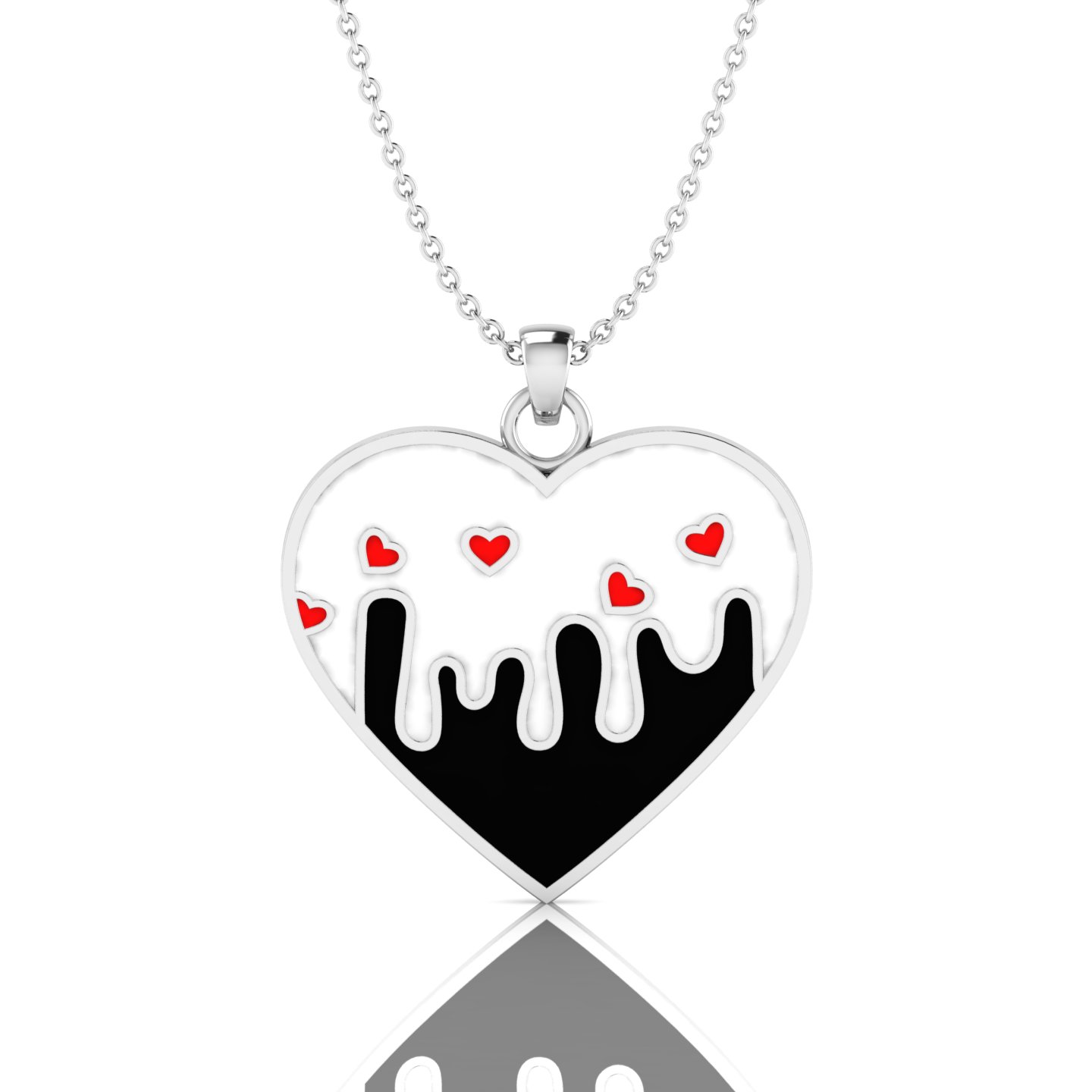 Finding the perfect birthday gift for a stylish friend is easy with this black and white enamel rose-gold plated melting love heart pendant. This heart-shaped pendant is made with a bright rose-gold-plated finish that gives it a shiny look. The design inside the heart is split into two parts that really stand out against each other. This heart pendant features a top half with a clean white enamel background, while the bottom half is filled with black enamel. The black part is designed to look like it’s melting or dripping upward into the white area, but the edges are kept soft and rounded. Within this enamel pendant, there are five tiny red hearts set across the white section to add a little extra detail. Each of these little hearts is outlined in rose-gold plating, which ties everything together. The red, black, and white colors stand out nicely against the pinkish rose-gold-plating. At the top, there is a rose-gold-plated bail connected to a small rose-gold-plated ring that holds the chain. The chain is a simple rose-gold-plated cable style chain. The whole piece is easy-to-wear design.