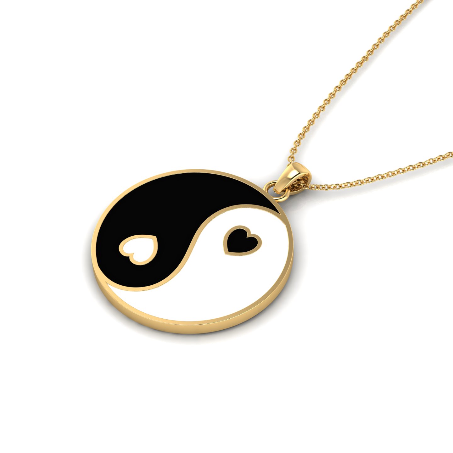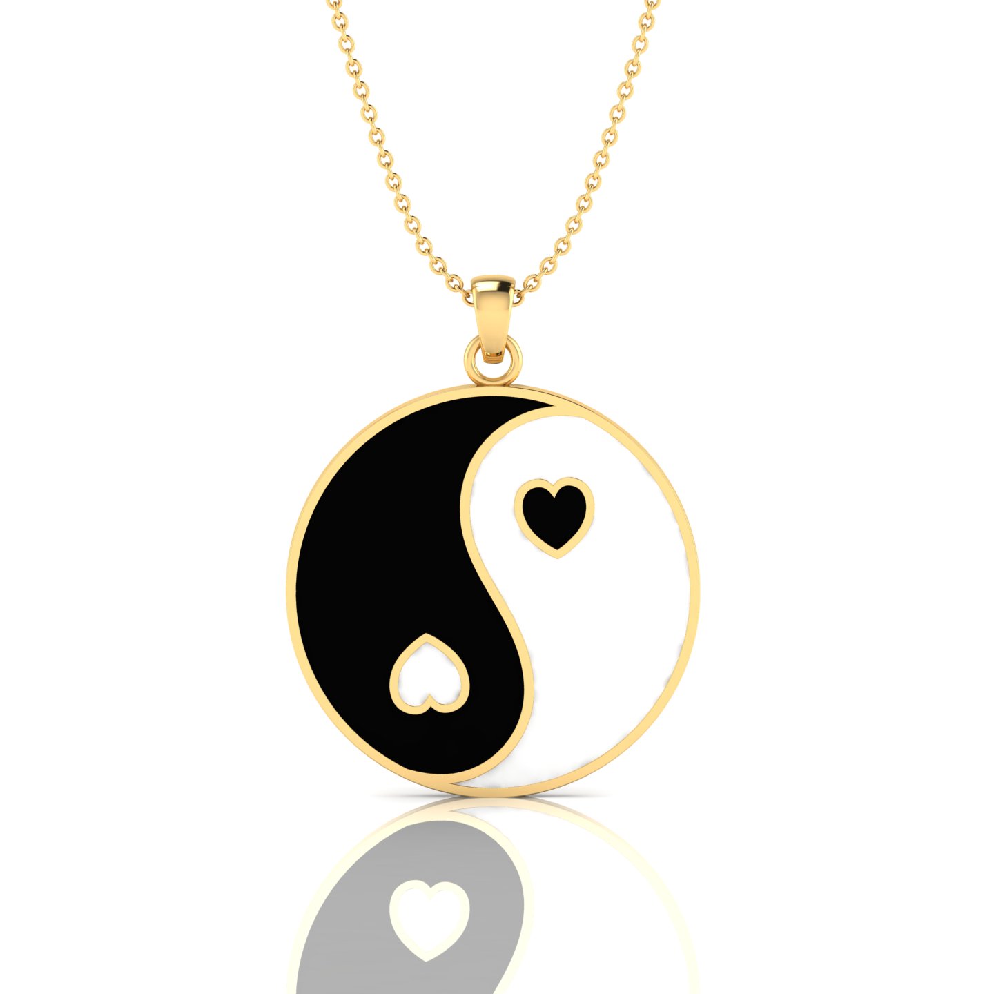 Celebrate life’s harmony with this black and white enamel rose gold plated yin yang feng shui pendant, which is a minimal and modern pendant with a glossy finish. This makes a meaningful son’s day gift to represent the bond between parent and child. It has a round, circular shape with a smooth rose-gold-plated border around the entire design. As a classic yin yang pendant, it follows a yin-yang style, divided into two flowing parts that fit together naturally. One part is finished in glossy black enamel, while the opposite part is finished in glossy white enamel, creating a clean and bold contrast. This striking enamel pendant features a curved line between the two sides that gives the pendant a balanced and fluid look. Each side features a small heart shape placed opposite each other, outlined in rose-gold plating to match the outer frame, making it a sweet gesture for a spouse or a dear friend. The rose-gold-plated edges and heart outlines are smooth, polished, and softly rounded. A simple rose-gold-plated bail is attached at the top, allowing the pendant to hang neatly. The pendant comes with a fine rose-gold-plated cable chain.
