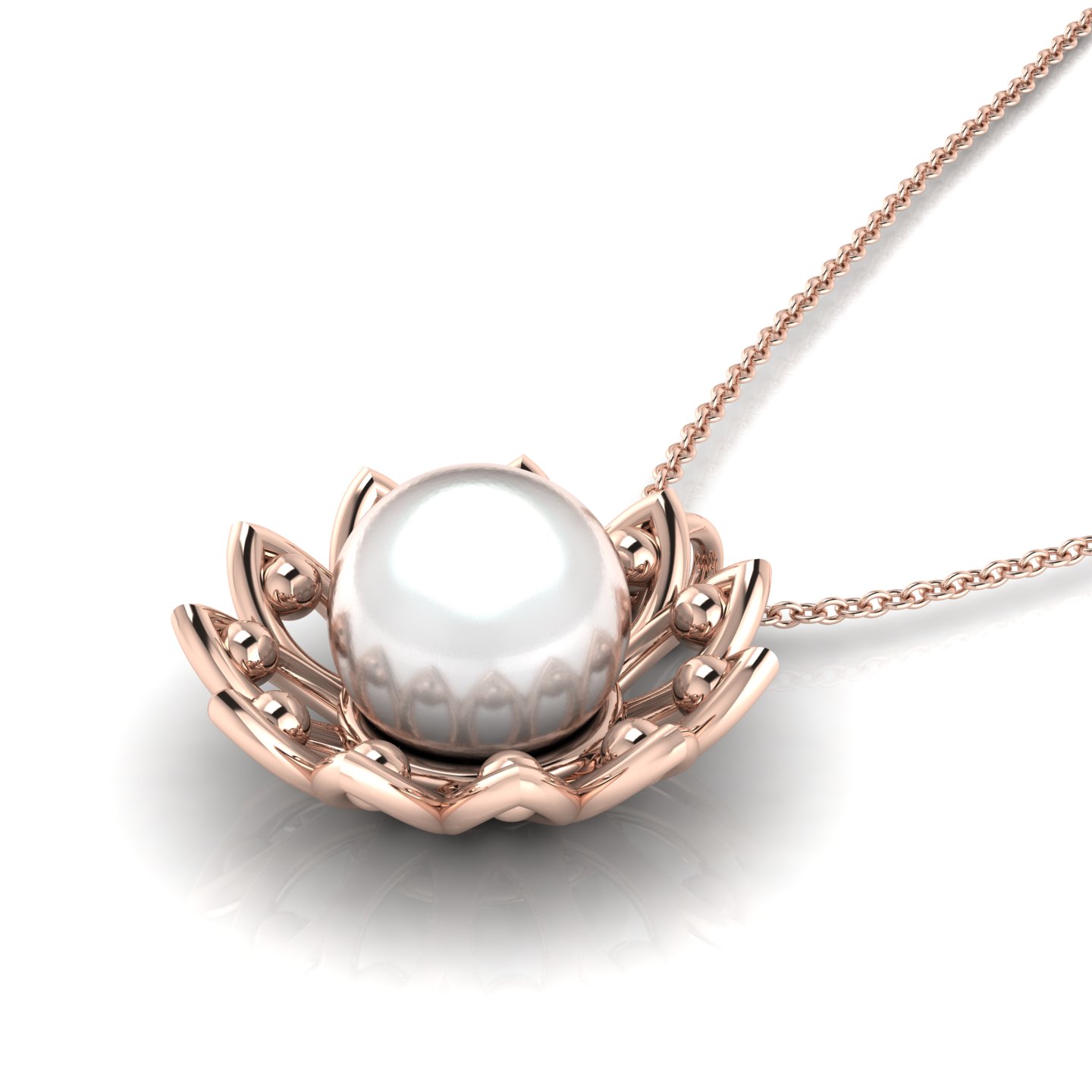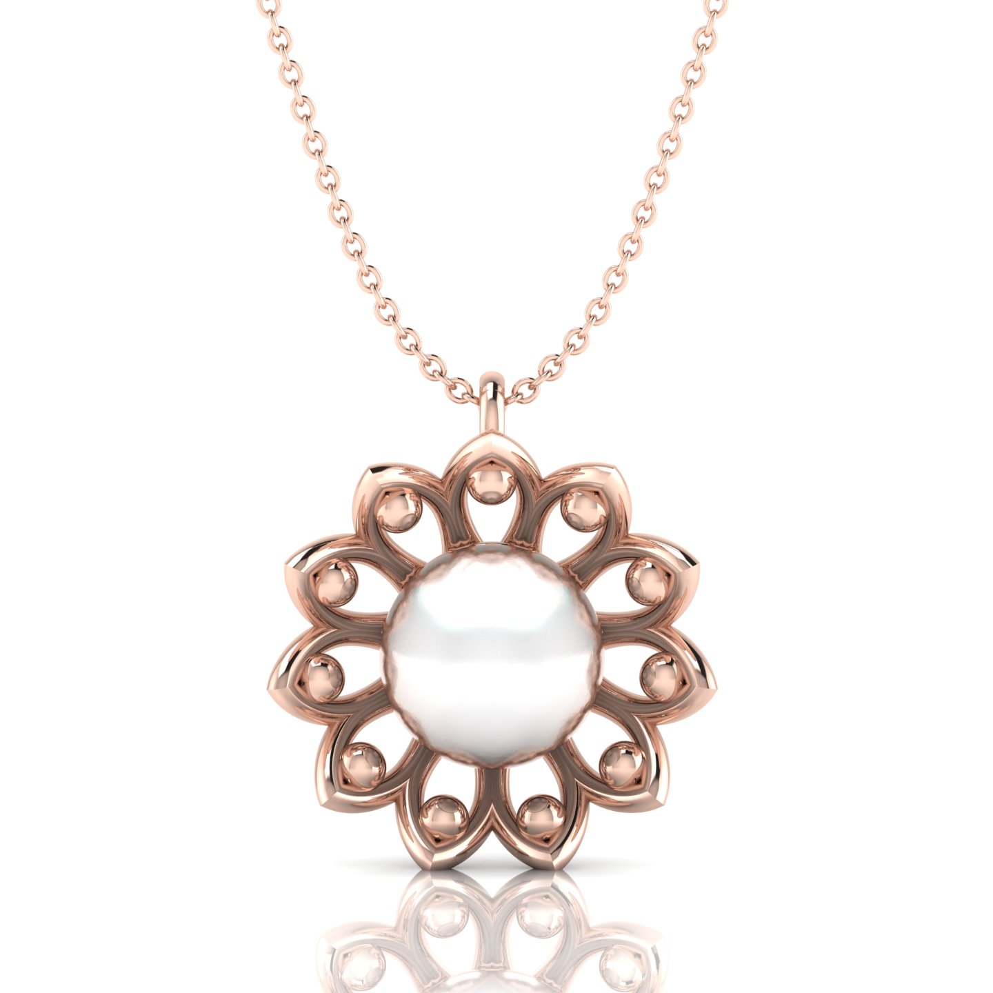 Created to reflect who you are without saying a word, This Freshwater Pearl Flower Blooming Gold Filled Pendant brings authenticity to your look. It has a floral design with a white pearl in the center, surrounded by golden petal-like structures and small golden spheres. The pendant hangs from a delicate gold chain, and its reflection is visible on the glossy surface beneath it. Pearls are considered versatile and can be worn for various occasions, complementing both western and traditional outfits. They are often recommended in astrology for certain zodiac signs such as Aries, Cancer, Scorpio, and Pisces.