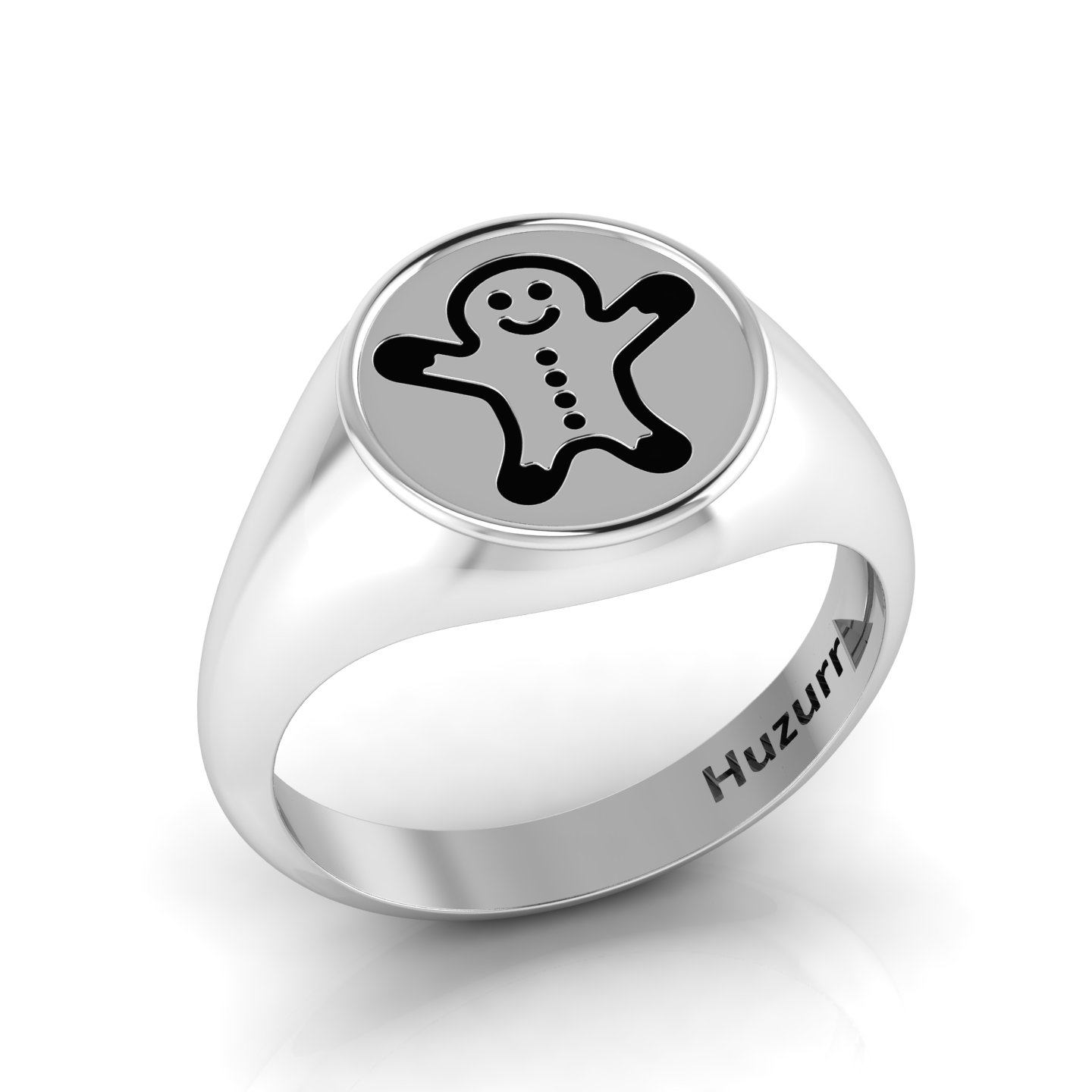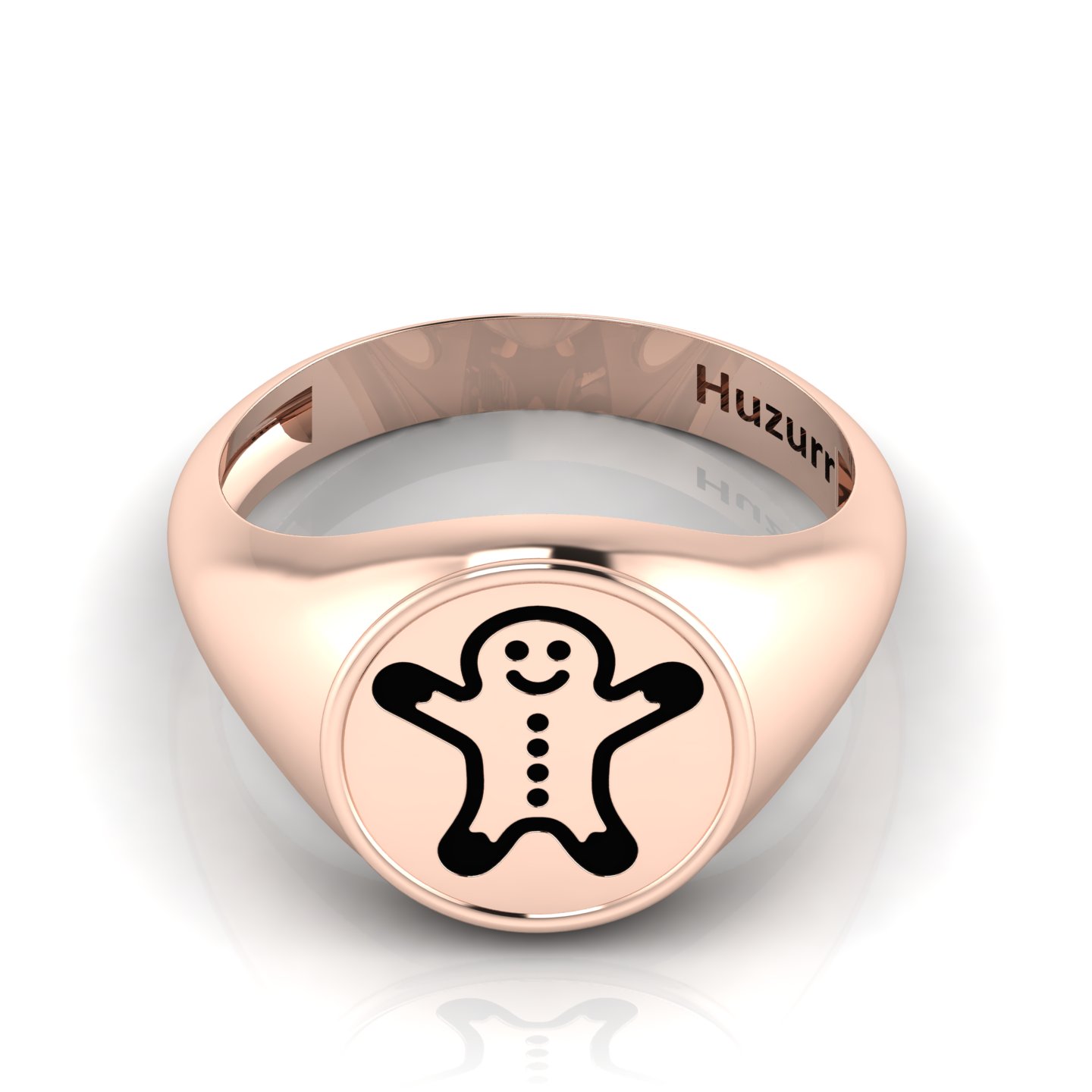 This classic signet-style ring has a gold-plated band with a flat, round disc. On this circular top, Right in the center of this disc, there's an engraving of a gingerbread man filled with black enamel. This gingerbread man looks cheerful with a simple, smiling face, outstretched arms and legs, and small dot details on its body. The band of the ring gets narrower as it goes down from the wide top, making it comfortable to wear and giving it a masculine look. Give this hand-engraved Easter basket surprise gift to a sibling, friend, or parent to celebrate springtime that is blending the nostalgia of holiday treats with a playful, timeless touch.