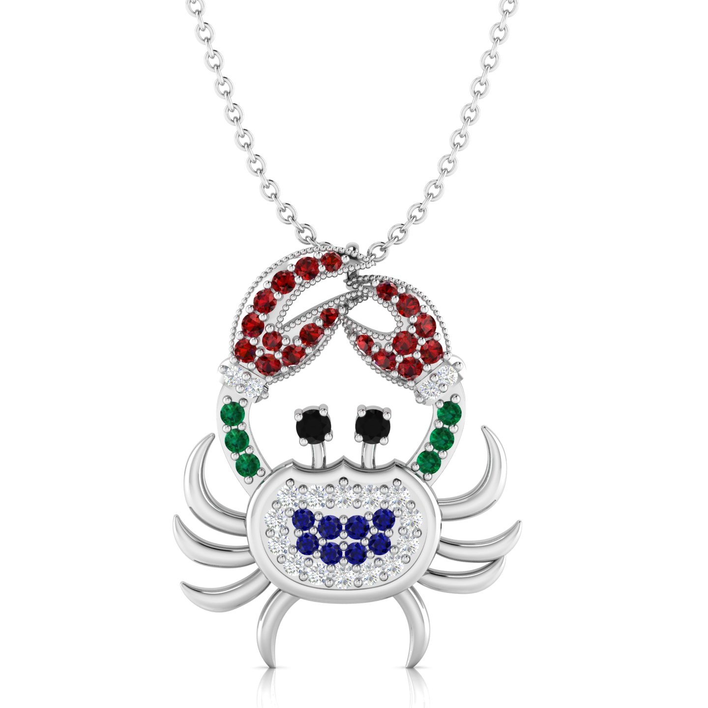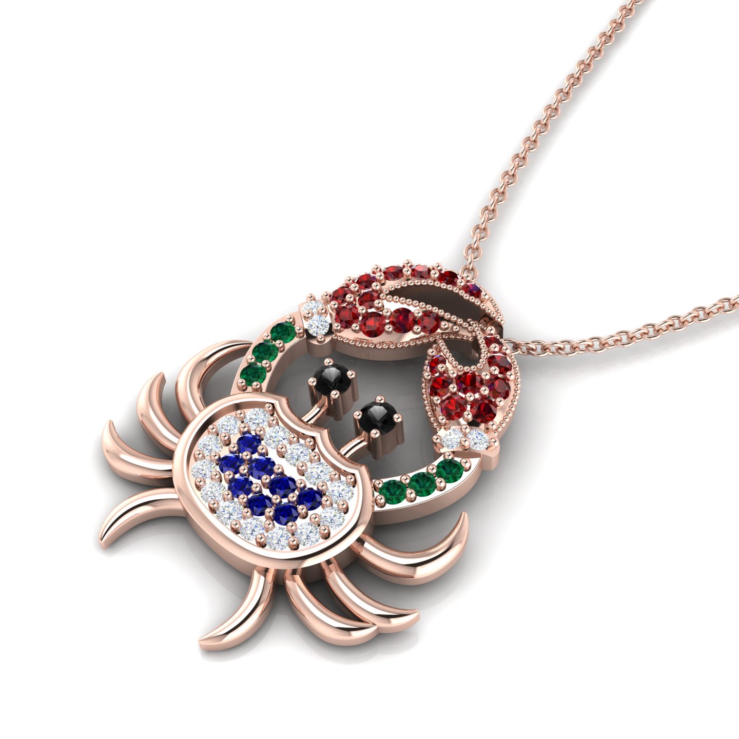 If you are looking for winter solstice gifts that stand out, this multicolor multi stone cocktail gold filled crab pendant is a stunning choice. The piece features a crab-shaped pendant with a gold-plated oval-shaped body, meticulously adorned with small diamonds on the outer sides and blue sapphires on the inner side, all in classic prong settings. It’s the kind of cocktail pendant that starts conversations at family dinners or holiday parties. The crab's eyes are represented by two round-cut black diamonds, adding a striking detail to the design that feels truly lifelike. You'll notice the claws are decorated with tiny milgrain dots resembling metal beads, expertly set with garnets in the upper side, diamonds in the middle, and emeralds at the bottom. Even with such detail, the crab has 10 legs which are all plain and simple, contributing to a refined and elegant look that doesn't feel overdone. Because the crab is also a Cancer zodiac sign, it serves as a meaningful tribute to a mother or daughter who cherishes their astrology. The pendant hangs from a delicate gold-plated cable chain, completing this charming and intricate design.