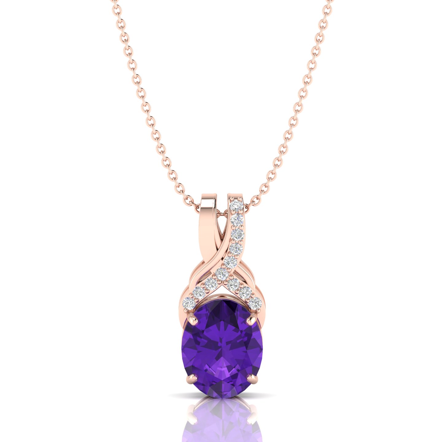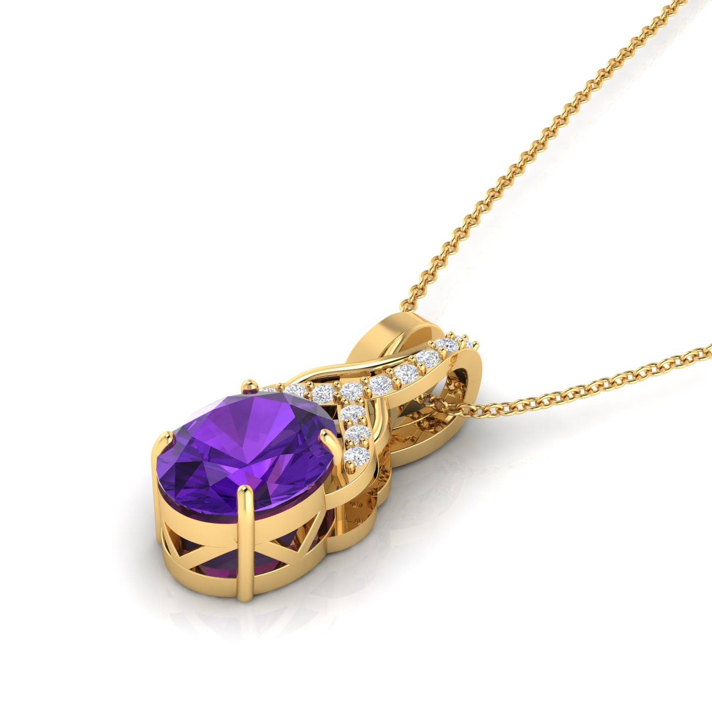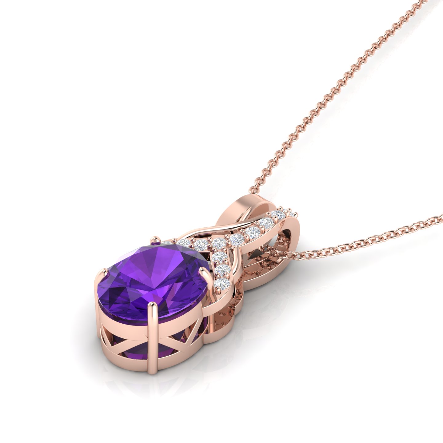 Oval Amethyst Twisted Bail Solitaire Sterling Silver Charm Pendant This necklace is easy to pair with any outfit. This necklace features a prong setting it is Crafted in rich 925 sterling silver. This necklace contains 11*9 MM mainstone amethyst and 1.5 MM moissanite. It has 3.6 GRM Approx weight, 9.6 MM Approx width and 22.75 MM Approx length. It is associated with promoting restful sleep, alleviating nightmares, and calming a restless mind. Amethyst is known for its soothing and calming properties, helping to reduce stress, tension, and anxiety.