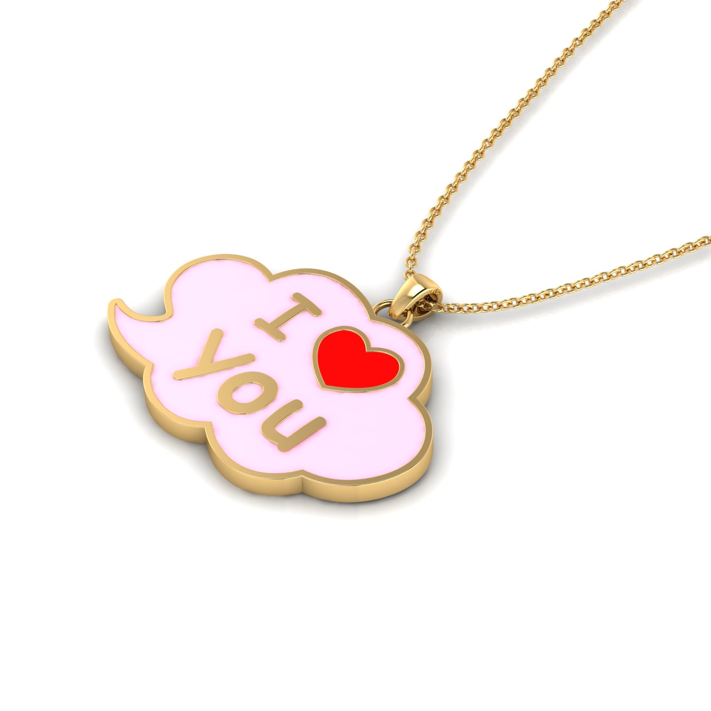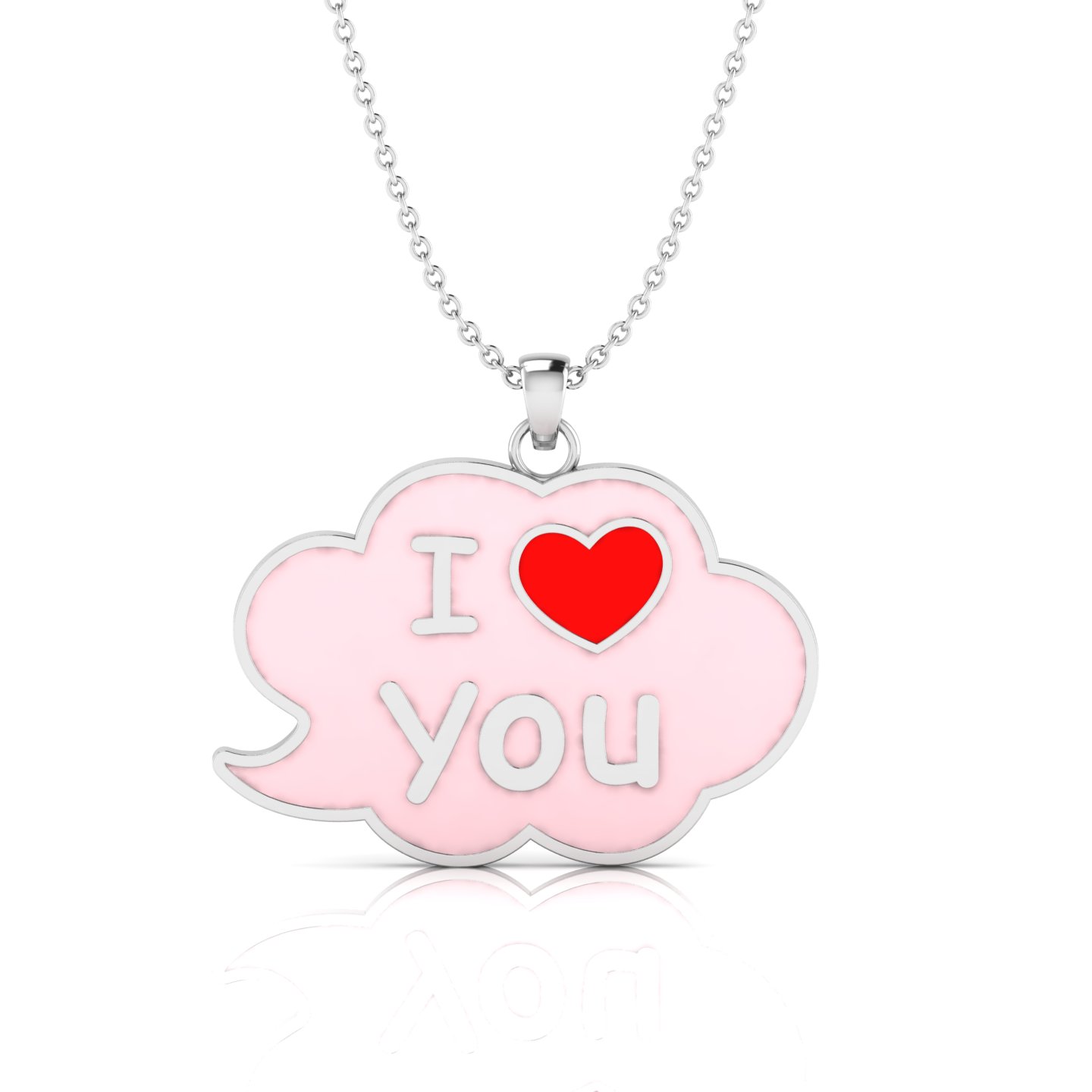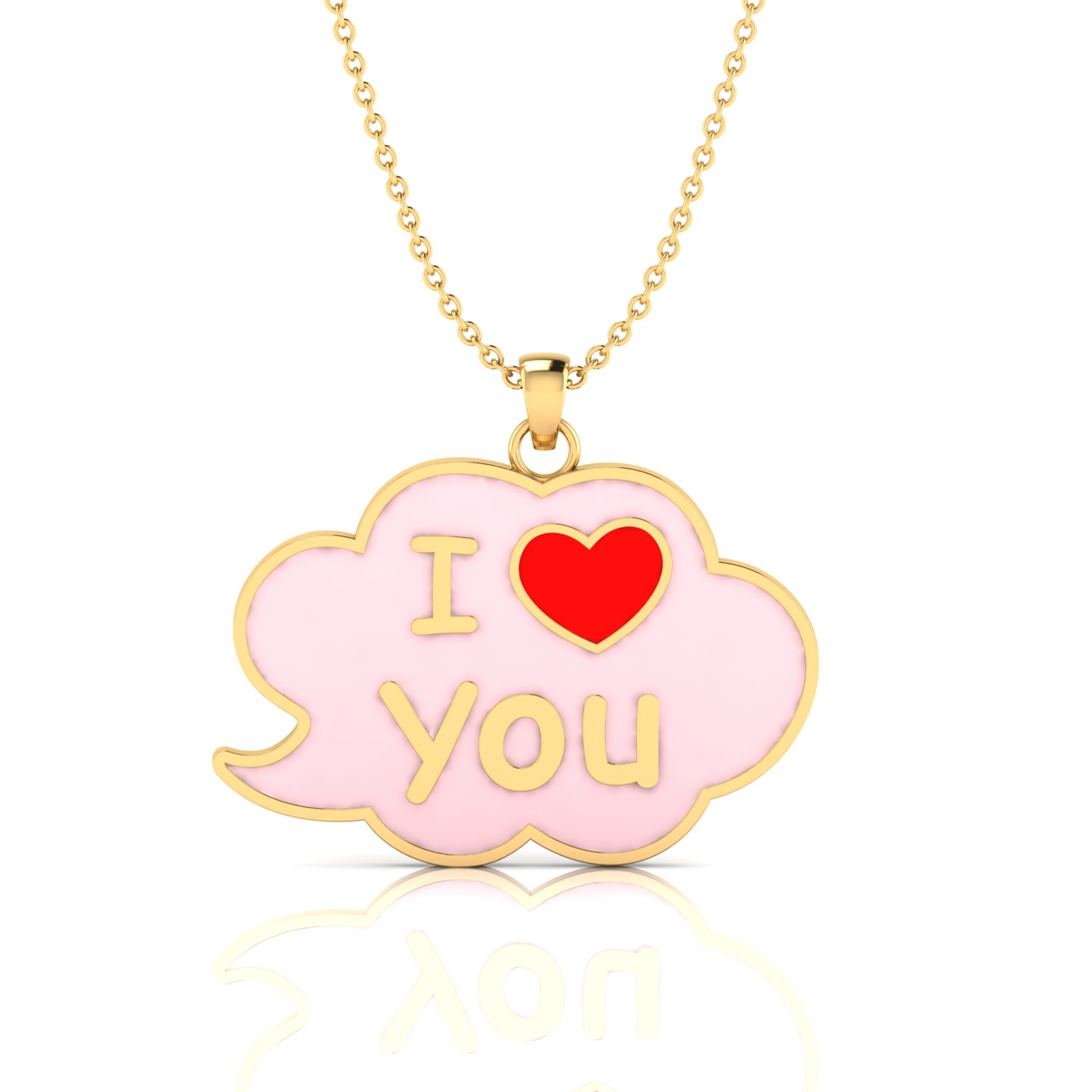 Whether for a sister or for friendship day, the pink enamel rose-gold-plated I Love You cloud charm pendant is shaped like a soft cloud or speech bubble with smooth, rounded edges. The entire cloud pendant is rose-gold-plated, including the border, letters, heart, and bail. The inside of the pendant is filled with pink enamel, which makes the rose-gold-plated details stand out. On the top left, there is a rose-gold-plated letter “I,” and on the top right, there is a heart shape filled with red enamel. Below them, the word “You” is written in rose-gold-plated letters with a rounded font to complete the I Love You pendant. The heart pendant hangs from a small rose-gold-plated ring and bail, which connects it to a fine rose-gold-plated cable chain. The pink enamel and pinkish rose-gold-plated enamel pendant design create a cute and simple “I ♥ You” look, perfect for everyday wear or as a gift.