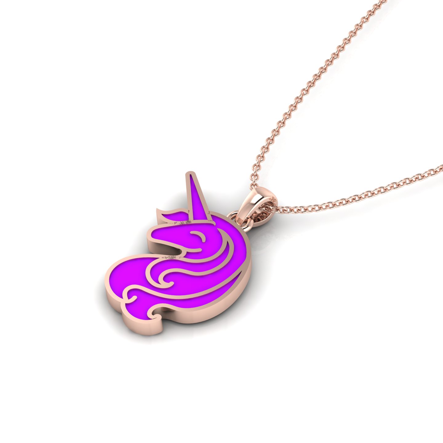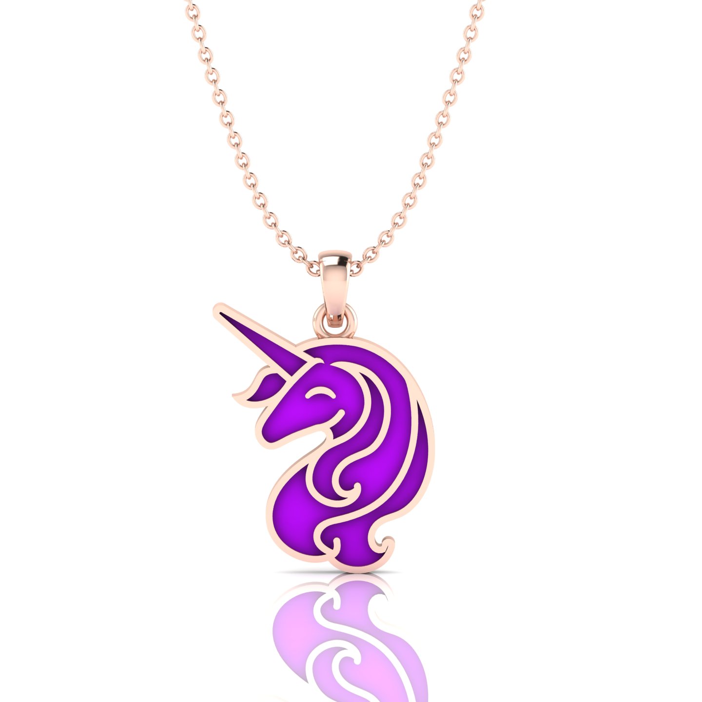 Add a bit of fairy-tale wonder to your relationship with this purple enamel gold-plated unicorn charm pendant. To provide a memorable promise gift for her, this pendant is shaped like a unicorn head in side profile, with a long, pointed horn and a smooth, curved face featuring a closed eye. Its flowing mane has soft, curved swirls with small decorative curls at the bottom. This unicorn pendant and the entire piece is gold-plated, with the outline defining the unicorn’s shape and separating sections of the mane for a neat, clear look. The inner surface is filled with purple enamel, which contrasts nicely with the gold-plated details. At the top, a gold-plated bail and small round ring connect this enamel pendant to a fine gold-plated cable chain. The combination of purple enamel and gold-plated design creates a stylish and charming unicorn pendant.