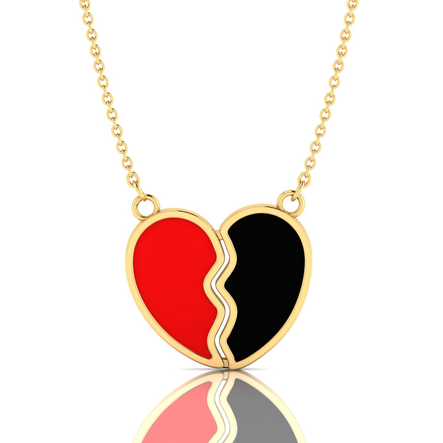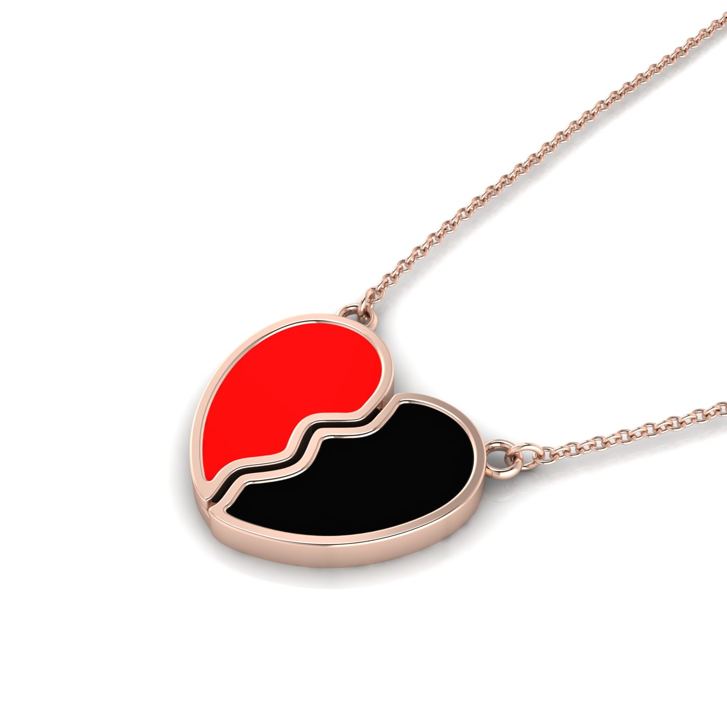 Give a gift that symbolizes two parts of a whole family story. This red and black enamel silver broken heart pendant features a heart-shaped design with a split structure that forms two matching halves. Our current clearance sale allows you to pick up these beautiful pieces for the whole family. One half is filled with black enamel, while the other half is filled with red enamel, creating a simple and clear contrast. The two halves are separated by a soft, wavy vertical line that gives the heart a smooth and balanced look. This split heart pendant is an ideal present for a daughter’s graduation or to share with a mother on Mother’s Day. Each half is outlined with a polished silver frame that keeps the shape clean and well-defined. The edges are rounded and glossy, with no sharp angles. Small silver loops are attached at the top of each half, connecting the pendant securely to a fine silver cable style chain. This enamel pendant is designed for those who appreciate fine details. The pendant hangs evenly and lightly, keeping the overall look neat and well-balanced.
