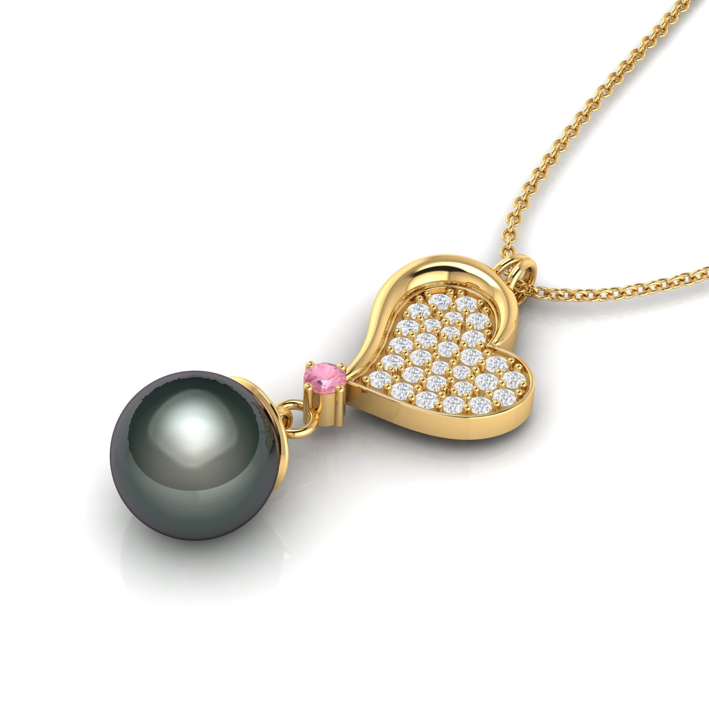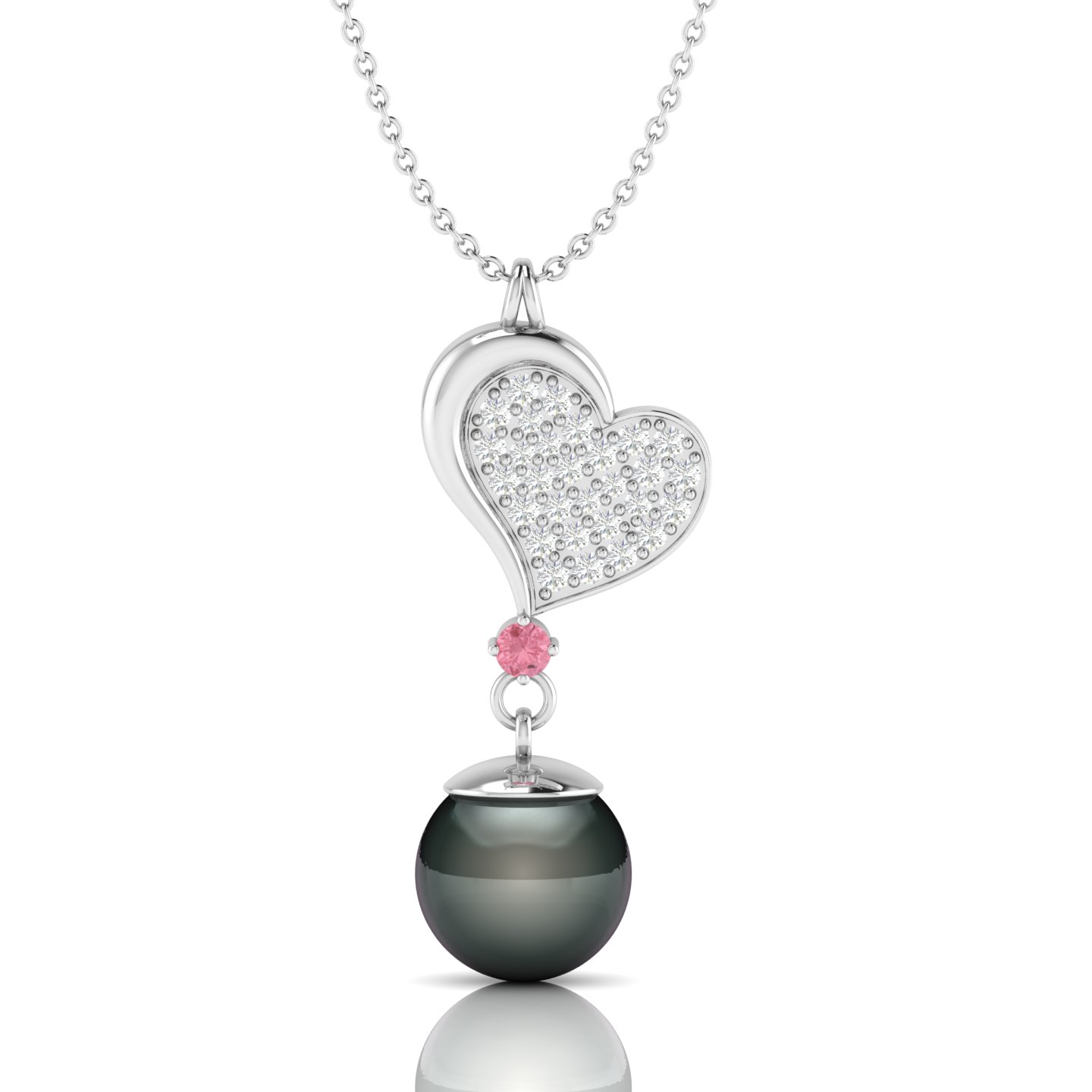 Designed to capture hearts, this piece brings sparkle, sentiment, and timeless charm to your collection. This necklace features a prong setting it is Crafted in rich 925 sterling silver with rose gold plating. This necklace contains 10 MM mainstone black pearl and 2.6/1.5/1.4/1.3/1.2 MM moissanites. It has 2.8 GRM Approx weight, 13.33 MM Approx width and 34.01 MM Approx hight. The soothing energy of Tahitian pearls is believed to calm the mind and body, promoting inner peace, emotional balance, and a sense of serenity.