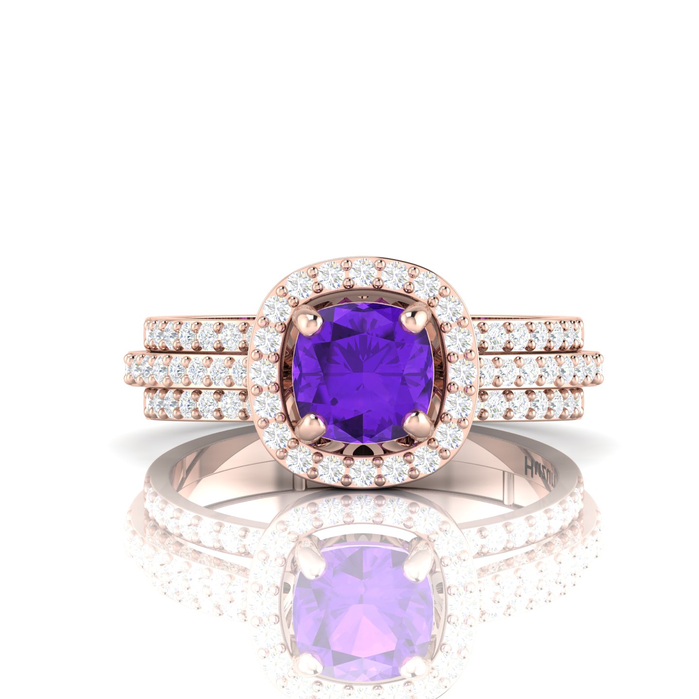 The preset Solitaire Silver Eternity engagement ring pave diamond accents that dazzle the wide, three row band design of this ring. These diamonds form a circle around the sparkling round cut, prong set diamond.